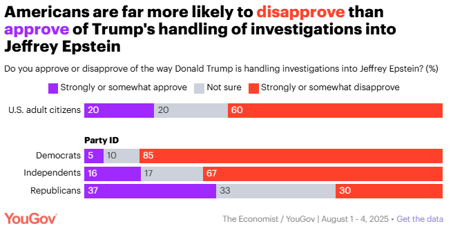 Unemployment concerns, Gaza, Epstein, trust and medicine, guns, and team names: August 1-4, 2025, Economist/YouGov Poll Taylor Orth and David Montgomery, YouGov This week’s Economist/YouGov poll covers… • Longstanding doubts about unemployment data • A shift in sympathies toward the Palestinians and away from Israel • Continuing bipartisan skepticism of Trump's handling of the Epstein inquiry • Diverging red and blue approaches to getting medical information • Bipartisan support for two gun-control measures and a partisan split on assault rifles • Two new team names in pro sports with few supporters