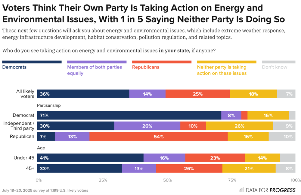 Trump’s economic approval rating ticks back up Eli Yokley & Cameron Easley, Morning Consult For the second week in a row, Trump’s approval rating sits at 45%, tying a record low measured during his second term in office, while 51% disapprove of his job performance, down 1 percentage point from the prior week. Ahead of Tuesday’s release of the federal government’s latest inflation report, perceptions of the president’s economic handling are on the upswing. Voters now only disapprove of Trump’s handling of the economy and trade by 1-point margins, which are down from respective 6- and 4-point deficits in our prior survey. Voters Report Seeing Material Benefits in Their Communities From State-Level Energy and Environmental Policies Grace Adcox, Data for Progress Data for Progress conducted a national survey to assess how voters perceive energy and environmental policy efforts in their state. When asked to consider which party in their state is more active on energy and environmental issues like extreme weather, energy infrastructure development, habitat conservation, and pollution regulation, a plurality of voters (36%) think Democrats take more action on these issues. About 1 in 4 voters see Republicans as more active, and nearly 1 in 5 voters (18%) think neither party is taking action on these issues.