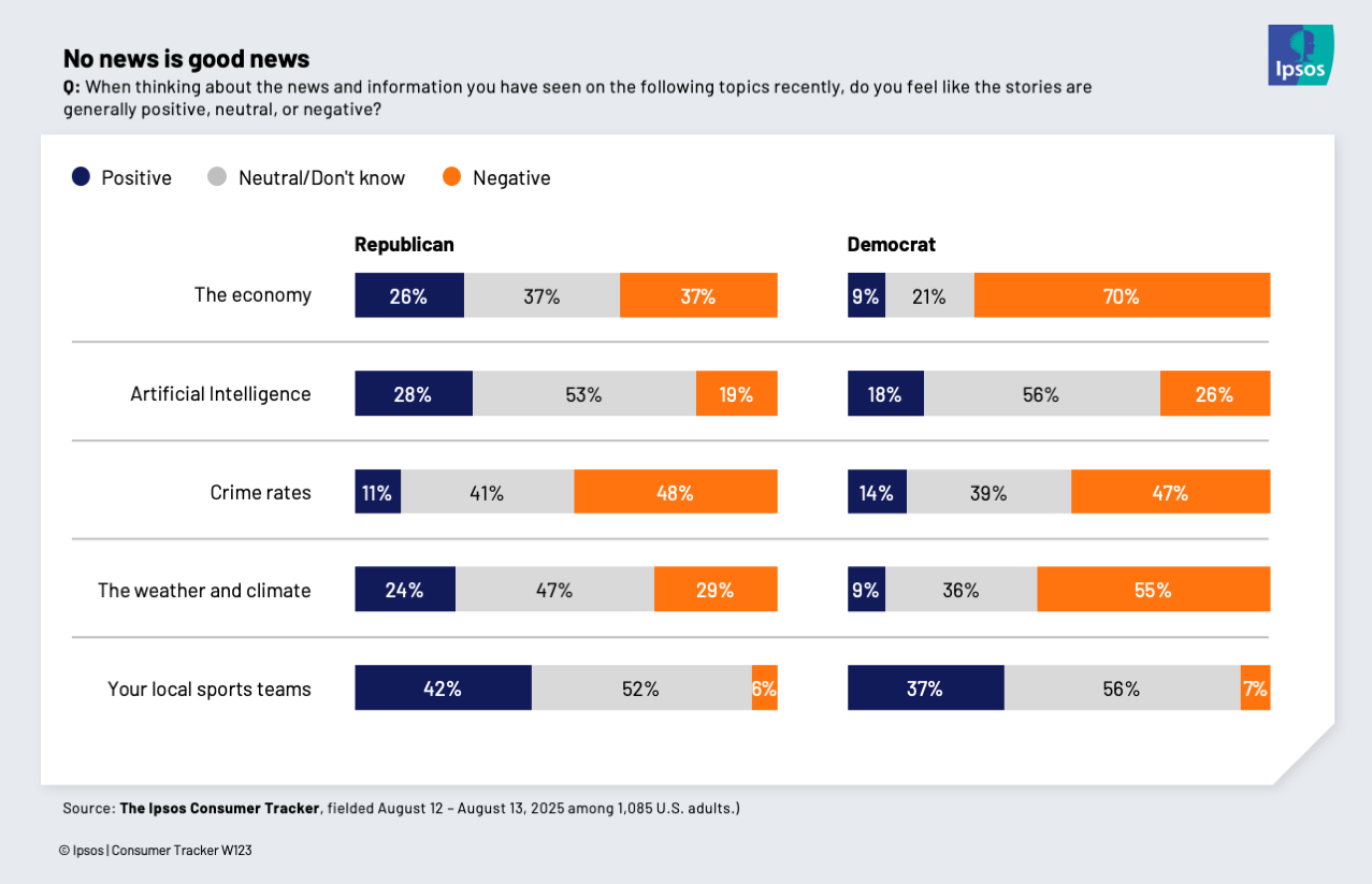 Most Americans aren't seeing positive news about the economy Matt Carmichael, Ipsos Few Americans say they're reading positive news about the economy, though more Republicans say they're seeing it than Democrats, according to new polling from the Ipsos Consumer Tracker