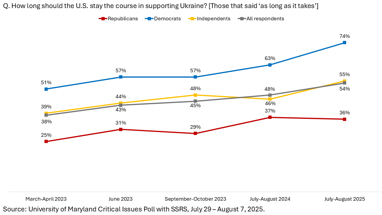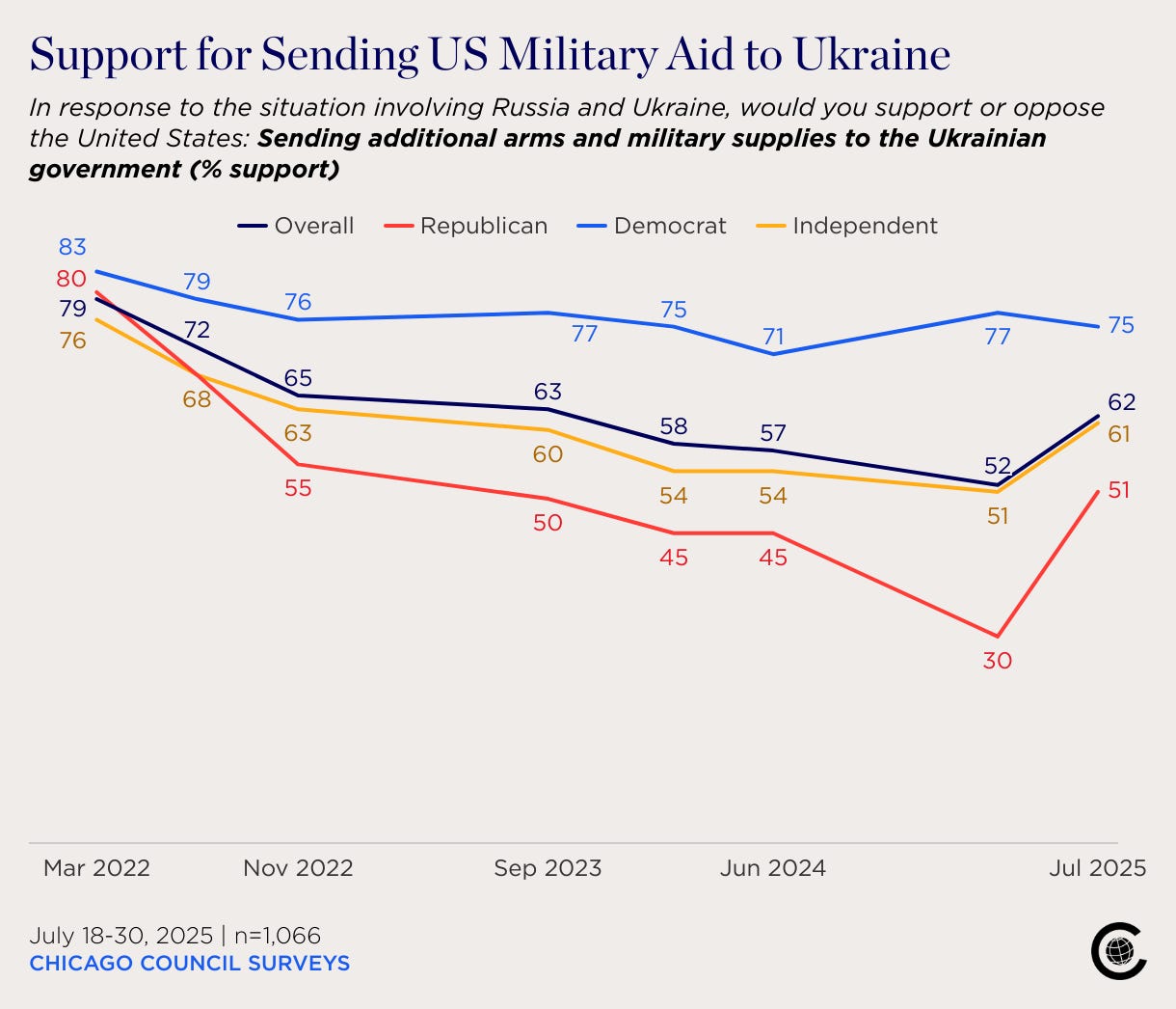 Dramatic Rise in Republican Support for Ukraine Dina Smeltz and Craig Kafura, Chicago Council on Global Affairs A just-completed Chicago Council on Global Affairs poll, fielded July 18–30, 2025, finds that American public support for sending military and economic aid to Ukraine has increased since March—especially among Republican Party supporters.