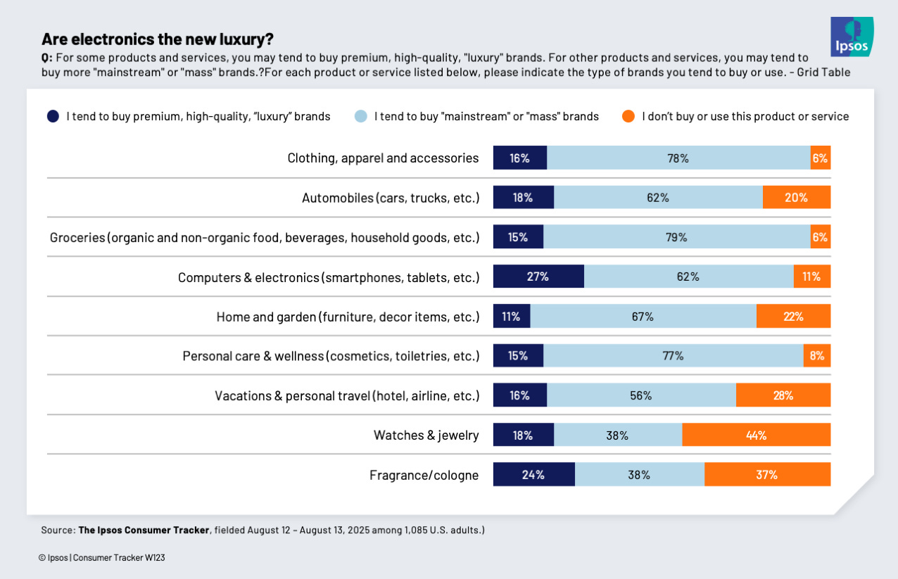 Are electronics the new luxury? Matt Carmichael, Ipsos The top two categories where people say they buy premium, high quality or “luxury” brands are electronics and fragrances/colognes, according to a new poll from the Ipsos Consumer Tracker
