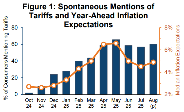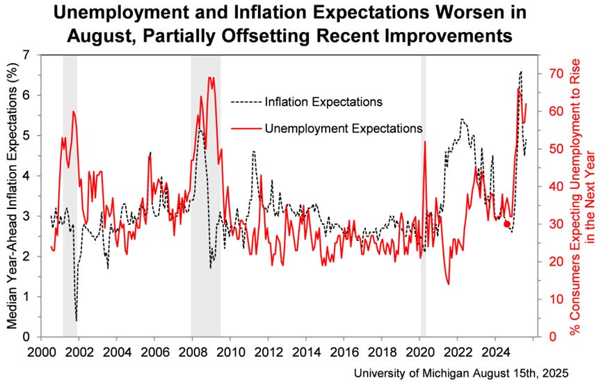 Rising worries about inflation Joanne Hsu, University of Michigan Consumer sentiment fell back about 5% in August, declining for the first time in four months. This deterioration largely stems from rising worries about inflation. Overall, consumers are no longer bracing for the worst-case scenario for the economy feared in April when reciprocal tariffs were announced and then paused. However, consumers continue to expect both inflation and unemployment to deteriorate in the future.