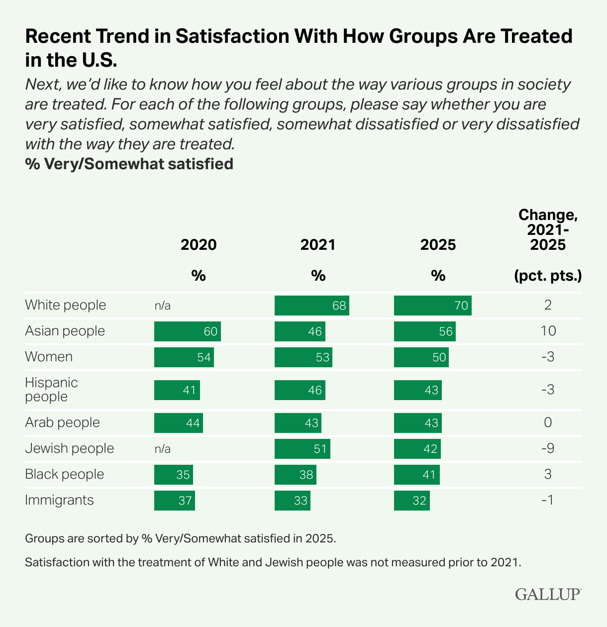 How Americans Perceive Treatment of Racial, Ethnic Groups Jeffrey M. Jones, Gallup Less than half of Americans are satisfied with the way immigrants and Black, Jewish, Arab and Hispanic people are treated in the U.S. Half are satisfied with the treatment of women, while majorities are comfortable with the way Asian and White people are treated.
