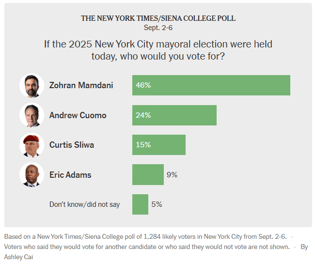 Mamdani Holds Huge Lead in Mayor’s Race, Times/Siena Poll Finds Nicholas Fandos and Ruth Igielnik, New York Times [unlocked] Zohran Mamdani, the Democratic nominee in the New York City mayoral race, is way ahead of his three rivals, but his lead would diminish considerably if the field shrank to a two-man race.