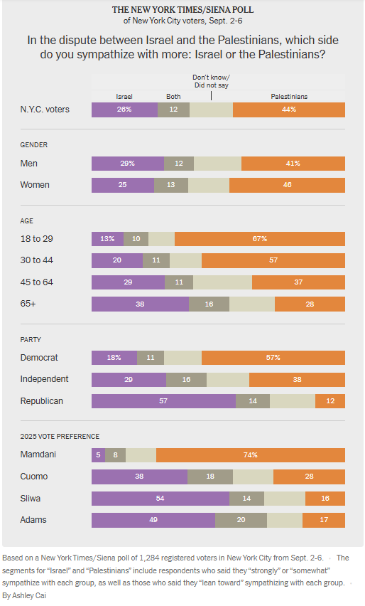 Vast Majority of Voters Want 9/11 Taught in Schools, Fear Future Attacks John McLaughlin, McLaughlin & Associates More Americans Face Uncertainty about their Retirement Future Thrivent New York City: Mamdani Leads by 19 Points in Mayoral Race Center for Public Opinion, UMass Lowell New York City: Mamdani Dominates Mayor's Race, Up 22 Points Over Cuomo In 4-Way Race Quinnipiac University Poll Gaza War Turns New Yorkers Against Israel, With Mayor’s Race as Backdrop Benjamin Oreskes and Ruth Igielnik, New York Times [unlocked]