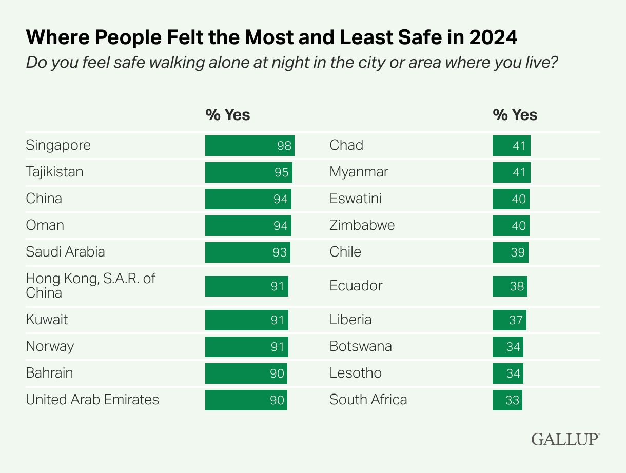 More People Feel Safe Even as Global Conflicts Rise Julie Ray, Gallup At the very moment the world is seeing more countries in conflict than at any time since World War II, more people than ever say they feel safe where they live. In 2024, Gallup’s global tracking reached a new milestone: 73% of adults worldwide said they feel safe walking alone at night in their city or area.
