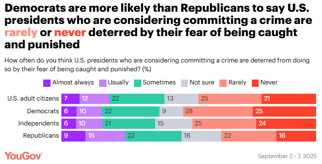 Crime and punishment: How often Americans think would-be criminals are deterred by the fear of being caught and punished Jamie Ballard, YouGov A new YouGov survey asked Americans how often they think would-be criminals — including U.S. presidents — are deterred from committing certain crimes because they are concerned about being caught and punished.