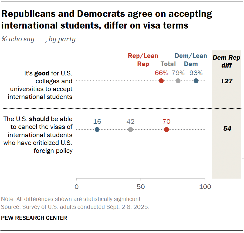 Americans tend to view international students positively, though some support limitations William Miner, Sneha Gubbala and Laura Silver, Pew Research Center Most Americans (79%) think it’s good for U.S. colleges and universities to accept international students. That includes majorities of both Republicans and Democrats, according to a Pew Research Center survey conducted Sept. 2-8. Still, sizable shares support certain restrictions on foreign students.