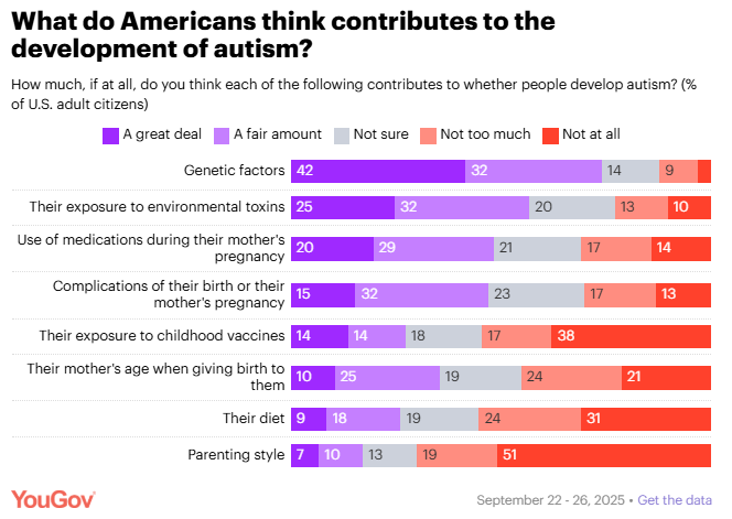 What Americans think contributes to pregnancy risks and autism Taylor Orth, YouGov Out of eight factors, Americans are most likely to say that genetics contributes a great deal or a fair amount to whether a person develops autism (74% say this). More than half (57%) say that exposure to environmental toxins does.