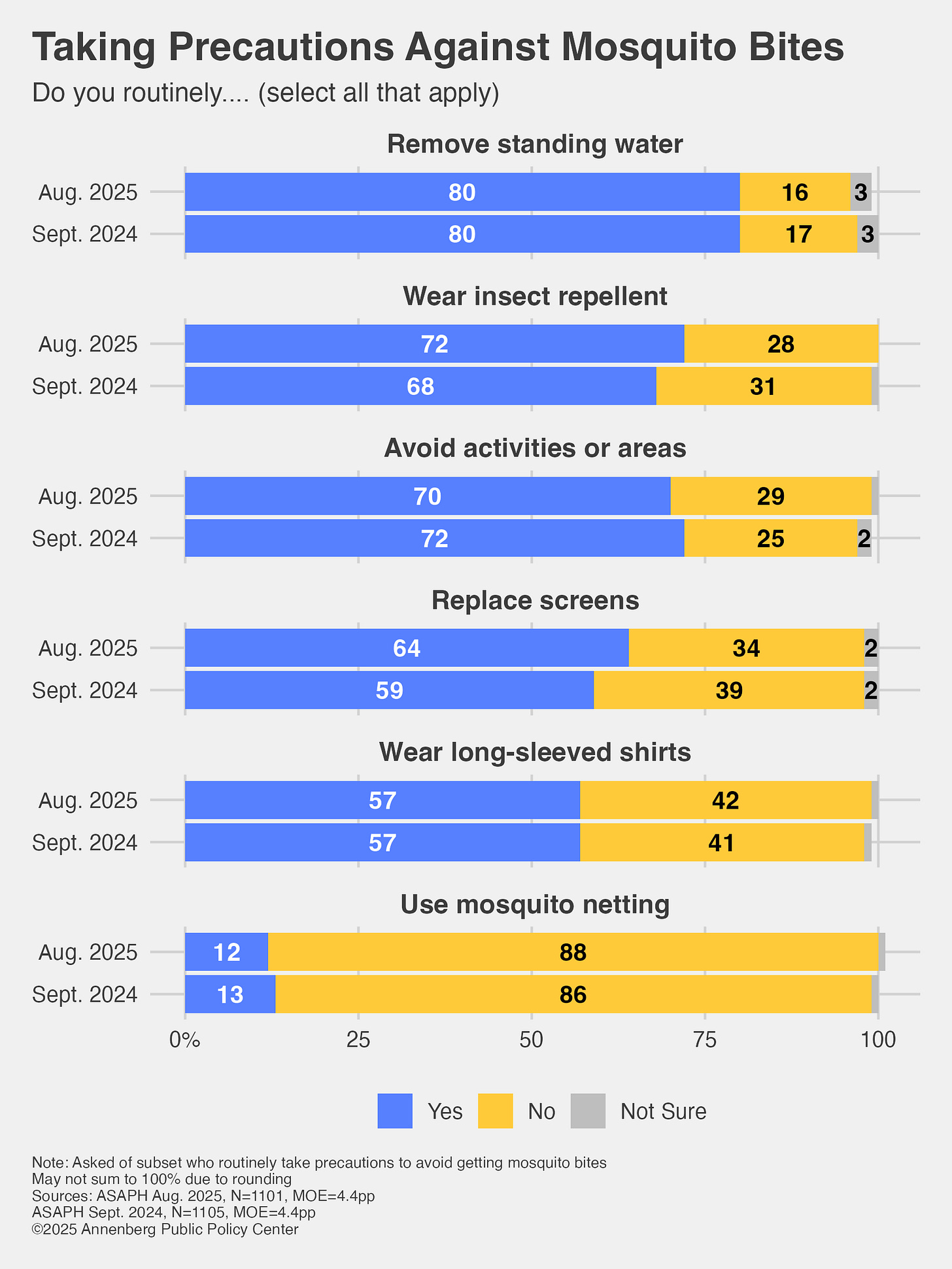 Despite Increase in U.S. Cases, Worry About West Nile Virus Remains Low Annenberg Public Policy Center, University of Pennsylvania Despite this season’s growing number of cases, relatively few Americans worry about becoming infected by West Nile or by dengue fever, another mosquito-borne illness, according to a survey of nearly 1,700 U.S. adults conducted August 5-18, 2025, by the Annenberg Public Policy Center of the University of Pennsylvania. Just 15% of respondents in the nationally representative panel report being worried that they or someone in their family will contract West Nile virus or dengue fever in the next three months.
