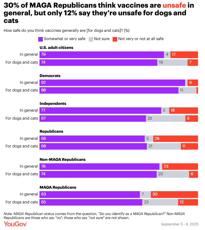 Vaccines for cats and dogs are politically polarized, too Jamie Ballard, YouGov A new YouGov survey on pets and vaccination finds that majorities of Americans — including majorities of Democrats and Republicans — believe that vaccinations for dogs and cats are safe. Self-identified MAGA Republicans are more likely than non-MAGA Republicans to hold negative views of vaccines, including their safety.