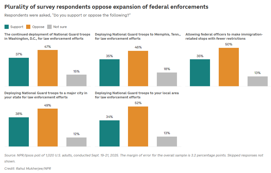 NPR-Ipsos poll: Americans don’t broadly support Trump’s National Guard deployments Debbie Elliott, NPR News Americans are concerned about crime, but don’t broadly support President Trump’s deployment of the National Guard to police U.S. cities according to a new NPR-Ipsos law enforcement poll.