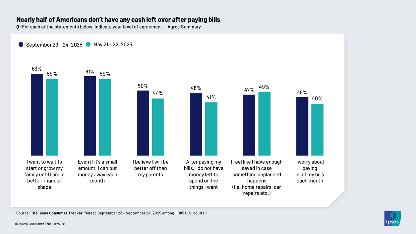 Nearly half of Americans don’t have any cash left over after paying bills Matt Carmichael, Ipsos The number of Americans who say that they don’t have any money left over after paying their bills is up to 48%, the highest it’s been since near-peak inflation in 2022, according to the Ipsos Consumer Tracker