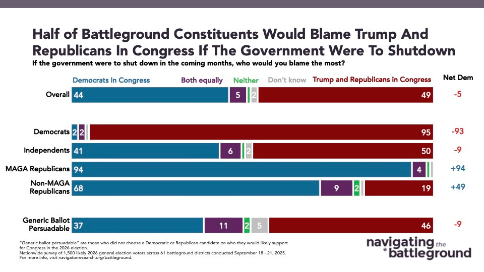 Americans in the Battleground Want Congress to Protect Health Care — Even If It Means Shutting Down the Government Ian Smith & Erica Seifert, Navigator Research • A majority of battleground constituents are aware of the potential shutdown, although few say they are hearing “a lot.” • Initial blame lies with Trump and congressional Republicans, but messaging does little to break up partisan alignment. • Medicaid, health care tax credits, and pushing back on tariffs are the main priorities for battleground constituents as they follow the shutdown fight.