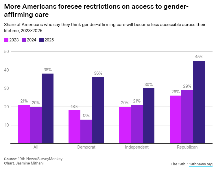 More Americans see a future where gender-affirming care will be harder to access Orion Rummler, 19th News A new 19th News/SurveyMonkey poll shows that the share of people who think gender-affirming care will get less accessible jumped to 38% from 20% in 2024.