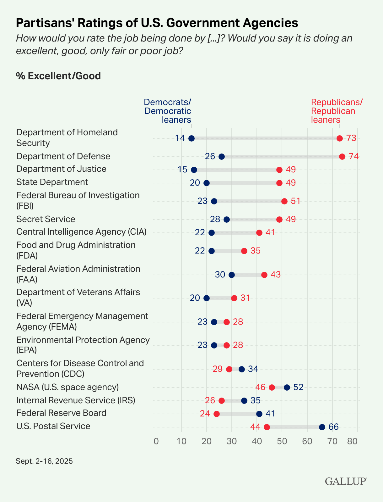 Americans’ Job Ratings of Six Key U.S. Agencies Worsen Megan Brenan, Gallup Americans’ job ratings of six federal agencies have deteriorated sharply since last year, and they are at or near their lowest points in Gallup’s trend. The only agency to show significant improvement is the Department of Homeland Security; however, it remains far below its 2017 peak. At the same time, the U.S. Postal Service continues to stand out as the highest-rated agency, maintaining a majority-level positive rating.
