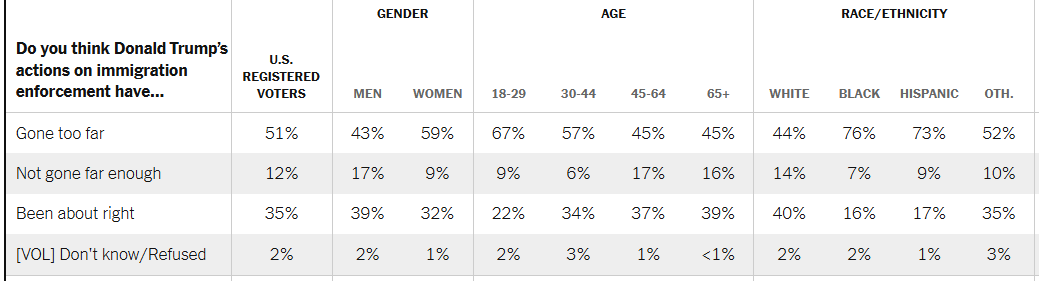 Voters Favor Deporting Those in U.S. Illegally, but Say Trump Has Gone Too Far Ruth Igielnik and Jazmine Ulloa, New York Times [unlocked] Nine months into President Trump’s mass deportation campaign, registered voters largely support the idea of removing immigrants who have arrived in the country illegally, even as majorities say they feel his methods have gone too far, according to the latest survey from The New York Times and Siena University.