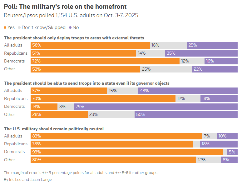 Most Americans don’t want troops deployed without an external threat, Reuters/Ipsos poll finds Jason Lange, Reuters Some 58% of Americans - including seven in 10 Democrats and half of Republicans - think the president should send armed troops only to face external threats, a sign of unease as President Donald Trump increasingly deploys National Guard troops to police American cities, a Reuters/Ipsos poll found. The poll, which ran Friday through Tuesday, also showed the Republican president’s approval rating ticking down to 40%.