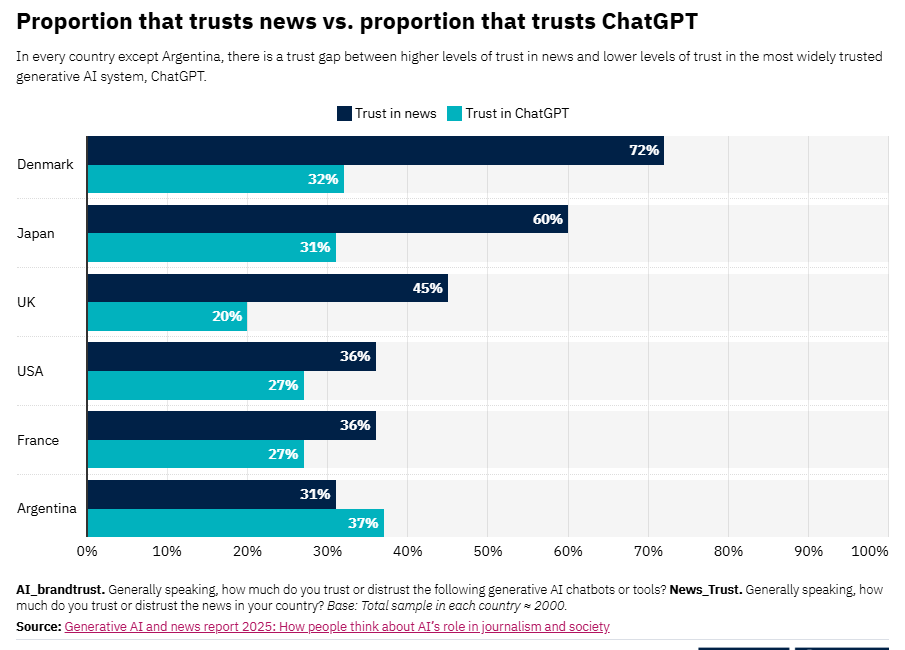Generative AI and news report 2025: How people think about AI’s role in journalism and society Felix Simon, Rasmus Kleis Nielsen and Richard Fletcher, Reuters Institute for the Study of Journalism Our survey in six countries (Argentina, Denmark, France, Japan, the UK, and the US) explored how people use generative AI in their everyday lives, what they think its impact will be on different areas of society, and what they think about its use in news and journalism specifically.