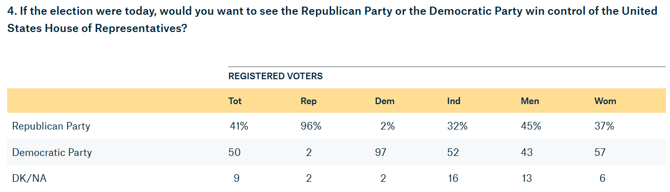 Trump Numbers Spike On Handling Of Israel-Hamas Conflict, Hit New Low On Economy Quinnipiac University Poll • 45 percent of registered voters think Republicans in Congress are more responsible for the government shutdown, while 39 percent think Democrats in Congress are more responsible and 11 percent volunteered that they think both parties are equally responsible. • If the Congressional midterm elections were held today, 50 percent of voters say they would want to see the Democratic Party win control of the US House of Representatives, while 41 percent say they would want to see the Republican Party win control. • Forty percent of voters approve of the way Donald Trump is handling his job as president, while 54 percent disapprove. • When it comes to Trump’s handling of the Israel-Hamas conflict, 47 percent approve, while 41 percent disapprove. • As for Trump’s handling of the economy, 38 percent approve, while 57 percent disapprove.