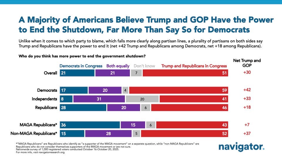 Government Shutdown Week 3: A Guide for Advocates Erica Seifert, Rachael Russell, Ian Smith, Maryann Cousens & Camille Keene, Navigator Research This Navigator Research report covers awareness of and blame for the government shutdown: • More Americans blame Donald Trump and Republicans in Congress for the shutdown than blame Democrats, with no shift in the last two weeks. • Americans are split on whether they have a positive or negative impression of what Democrats in Congress are fighting for in the shutdown. • More think Trump and Republicans should compromise with Democrats than the reverse, and more see Trump and Republicans as having power over whether the shutdown continues.