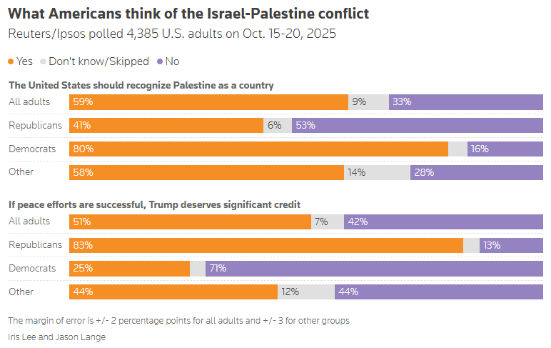 Most Americans support US recognition of Palestinian state, Reuters/Ipsos poll shows Jason Lange, Reuters [via Yahoo] Most Americans — including 80% of Democrats and 41% of Republicans — think the U.S. should recognize Palestinian statehood, a sign that President Donald Trump’s opposition to doing so is out of step with public opinion, a Reuters/Ipsos poll found.