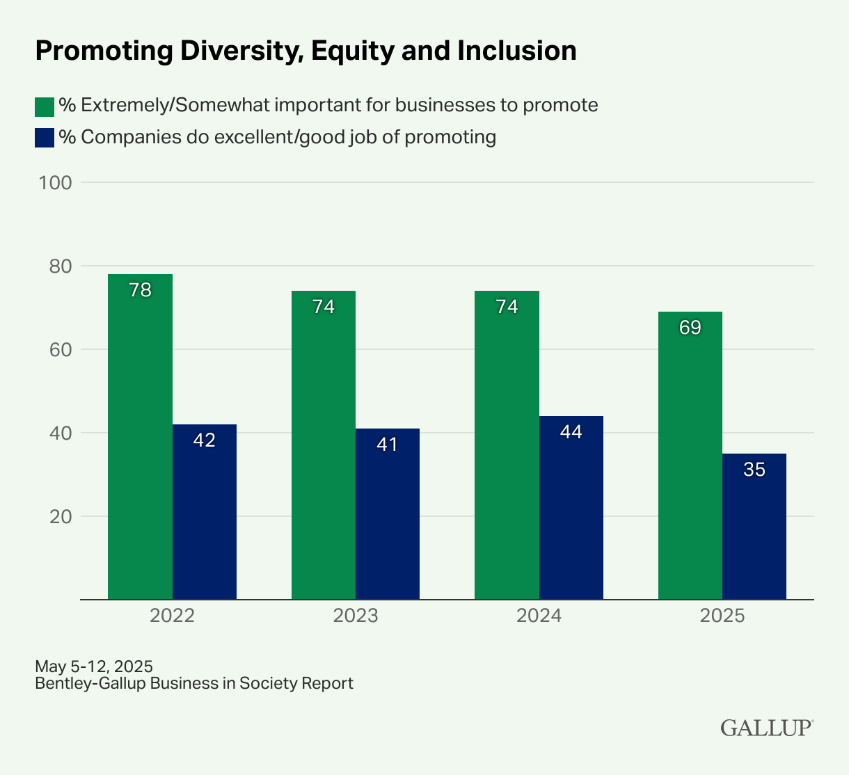 Fewer Americans See Diversity as a Business Priority Julie Ray, Gallup Most Americans continue to see diversity, equity and inclusion (DEI) as part of a company’s responsibility. Still, fewer now view it as a top business priority, even as many continue to link diversity with greater innovation and stronger profits. These findings from the latest Bentley University-Gallup Business in Society survey are based on a web survey of 3,007 U.S. adults conducted from May 5-12, 2025, using the probability-based Gallup Panel.