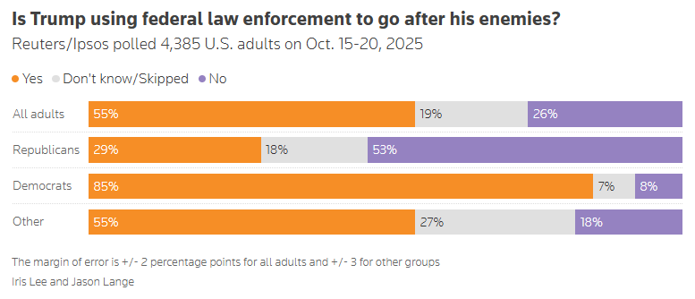 Majority of Americans think Trump is targeting enemies, Reuters/Ipsos poll finds Jason Lange, Reuters More than half of Americans, including about three in 10 Republicans, believe President Donald Trump is using federal law enforcement to go after his enemies, according to a new Reuters/Ipsos poll that also found growing concern about U.S. political divisions nine months into his second term in office.