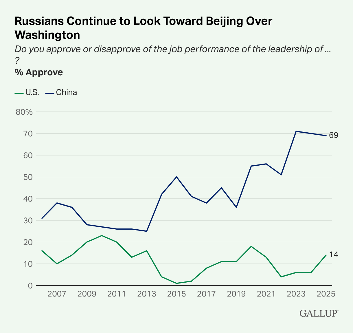 Russians’ Approval of China Firms as Global Order Shifts Benedict Vigers, Gallup Russians had been warming toward Beijing even before its invasion of Ukraine, but approval has strengthened since. Today, Russia not only gives China its highest ratings outside of Africa but also leads the world in relative alignment with Beijing over Washington.
