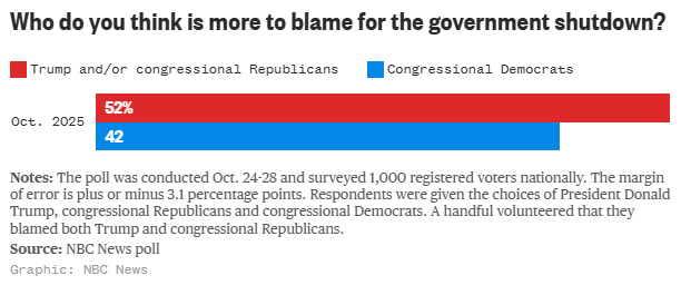 Republicans shoulder more shutdown blame, as signs of voter irritation with both parties pile up Bridget Bowman, NBC News Voters say President Donald Trump and Republicans in Congress are more to blame for the ongoing government shutdown, according to a new NBC News poll. But their verdict on the spending stalemate includes more blame for Democrats than some past shutdowns, part of a growing collection of data outlining negative views of both parties.