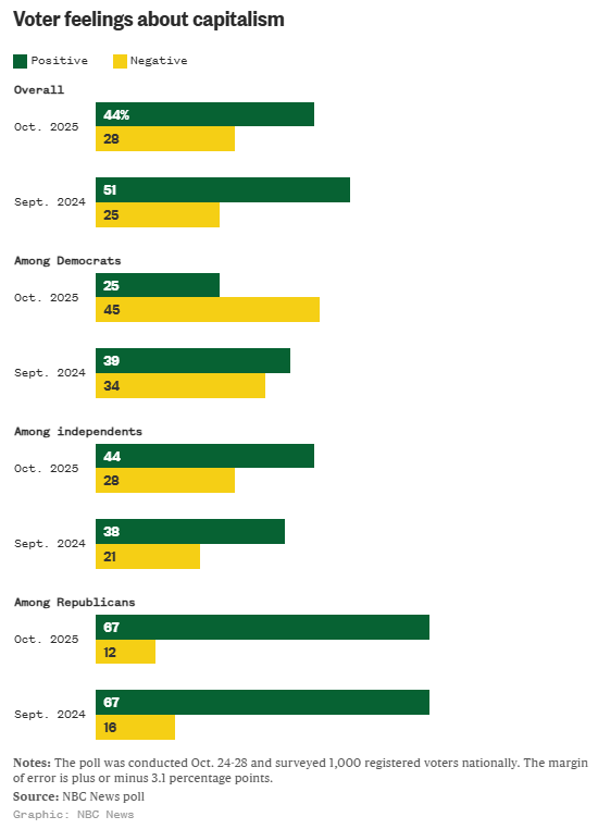 Views of capitalism slip, but socialism is still unpopular as Zohran Mamdani gains prominence Ben Kamisar, NBC News The share of registered voters with positive views of capitalism has dropped under 50% for the first time in seven years of NBC News polling on the issue — a shift that comes as some democratic socialists, like New York mayoral hopeful Zohran Mamdani, gain prominence in the Democratic Party.