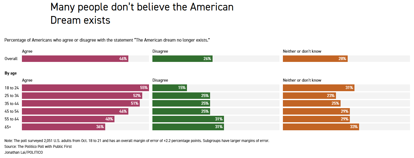 New poll shows what Americans think of America, and it’s not great Erin Doherty, Politico Nearly half of Americans, 49 percent, say that the best times of the country are behind them, according to The POLITICO Poll by Public First. That’s greater than the 41 percent who said the best times lie ahead, underscoring a pervasive sense of unease about both individuals’ own futures and the national direction. The sense of pessimism about the future comes amid a widening perception of political polarization. More than half of U.S. adults, 59 percent, said that political polarization is “much” or “somewhat” worse than it was five years ago, with Americans over 65 much more likely to hold that view, according to the survey.