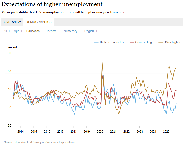 Short-Term Inflation Expectations Decline; Labor Market Expectations Mixed Center for Microeconomic Data, Federal Reserve Bank of New York The Federal Reserve Bank of New York’s Center for Microeconomic Data released the October 2025 Survey of Consumer Expectations, which shows that households’ inflation expectations decreased at the short-term horizon and remained unchanged at the medium- and longer-term horizons. Unemployment rate and job finding expectations worsened, while job loss expectations slightly improved.