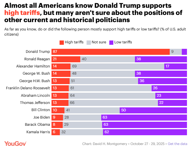 How do Americans think Reagan felt about tariffs? David Montgomery, YouGov Most Americans identify Trump as a supporter of high tariffs, and half or more say recent Democratic politicians Kamala Harris, Barack Obama, Joe Biden, and Bill Clinton support low tariffs. Other figures, from Thomas Jefferson and Abraham Lincoln to Reagan and George W. Bush, have large shares of Americans unsure about their preferred tariff policy.