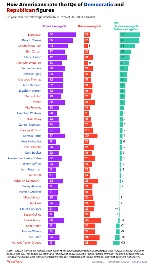 Which political figures Americans think have above- and below-average IQs Taylor Orth, YouGov President Donald Trump has frequently used the phrase “low IQ” to insult some of his foes — particularly women and Black Americans. Trump has also touted what he claims to be his own high IQ, as well as that of his ally Elon Musk. A new YouGov poll asked Americans about their own IQs — and the IQs of 38 political figures, including Trump’s.