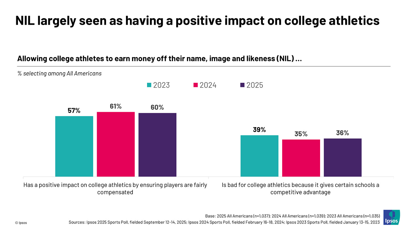 NIL remains broadly popular, but some have worries about the future of college athletics Johnny Sawyer, Ipsos The landscape of college athletics has changed dramatically in recent years driven by the introduction of Name, Image, and Likeness (NIL) rights for athletes in 2021 and the rollout of athlete revenue sharing this year. Amid these changes, new Ipsos data finds that Americans strongly support student-athletes getting paid. However, the seismic shifts in the landscape of college athletics over the past five years have not come without concerns.