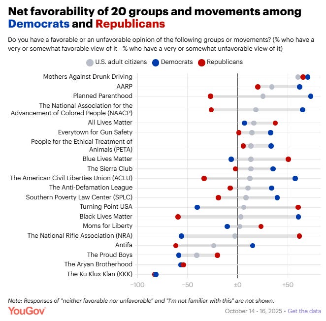 What Americans think about 20 political, activist, and extremist groups Jamie Ballard, YouGov New YouGov polling about 20 political, activist, and extremist groups finds that Mothers Against Drunk Driving is viewed more favorably than unfavorably by Americans overall and within political, racial, gender, and age groups. Black Lives Matter, Antifa, Moms for Liberty, and Turning Point USA are viewed more divisively.