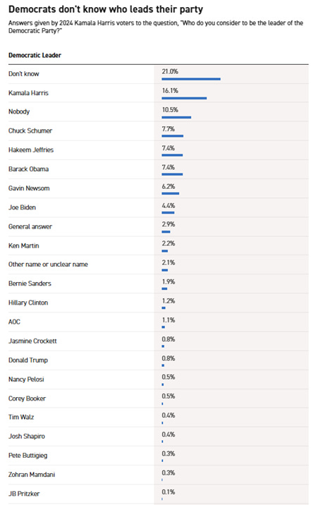 POLITICO Poll: Here’s who Democrats think is their leader Samuel Benson and Anna Wiederkehr, Politico Seismic victories in a series of off-cycle elections on Tuesday showed the power of an energized liberal base all across the country — and teased at the potential for the Democratic Party to storm back to power. But those wins did not immediately crown a singular leader who can harness that energy. There are still dozens of competitors for the throne.