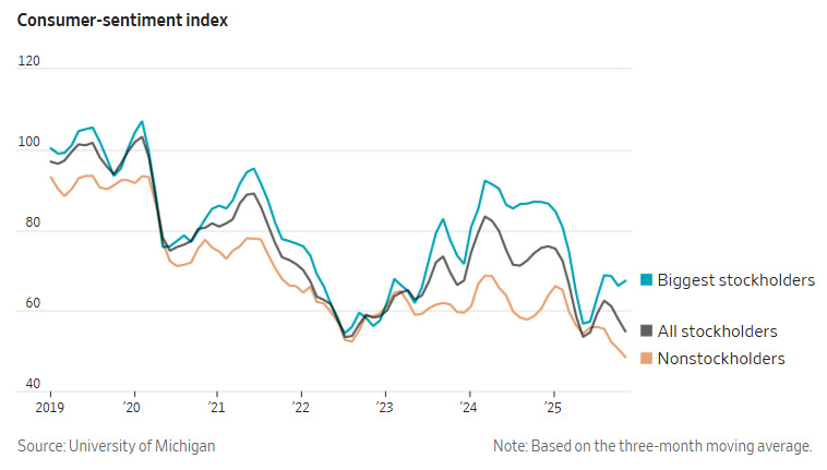 Feeling Great About the Economy? You Must Own Stocks Rachel Louise Ensign and Rachel Wolfe, Wall Street Journal [unlocked] Investors’ rosy feelings about their stock market gains are powering spending—but it’s a different story for everyone else