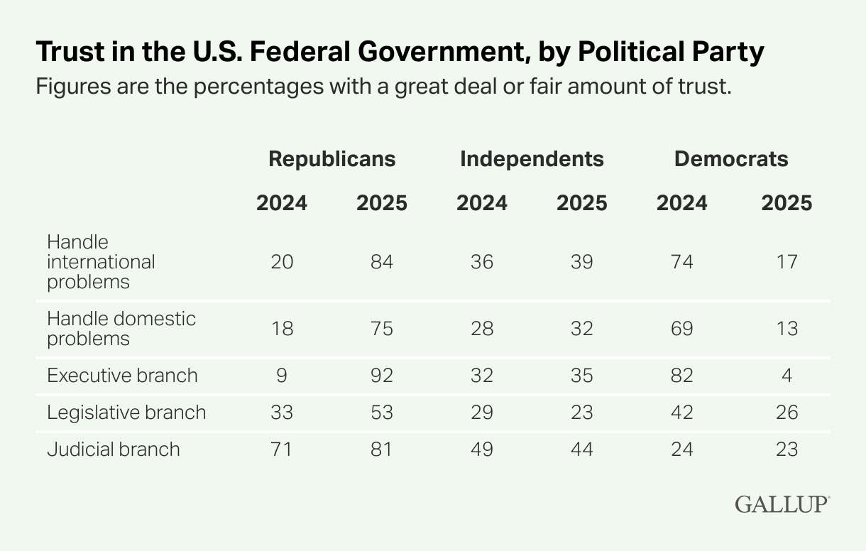 U.S. Trust in Government Depends Upon Party Control Jeffrey M. Jones, Gallup The level of trust that Americans have in the government and the nature of that trust have been transformed over the past 50 years, especially in the past two decades. Far fewer Americans trust the federal government today than in the past, and those changes are driven in large part by the collapse of trust among people who are not aligned with the party of the sitting president.