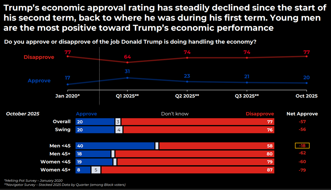 The Melting Pot, November 2025: African American Voter Opinion Global Strategy Group This latest installment of GSG’s ongoing series, The Melting Pot, takes an in-depth look at how Black voters are experiencing Trump 2.0. While Black voters continue to be a strong and reliable Democratic bloc, Democrats have an important opportunity to further strengthen support and engagement, particularly among younger Black men.