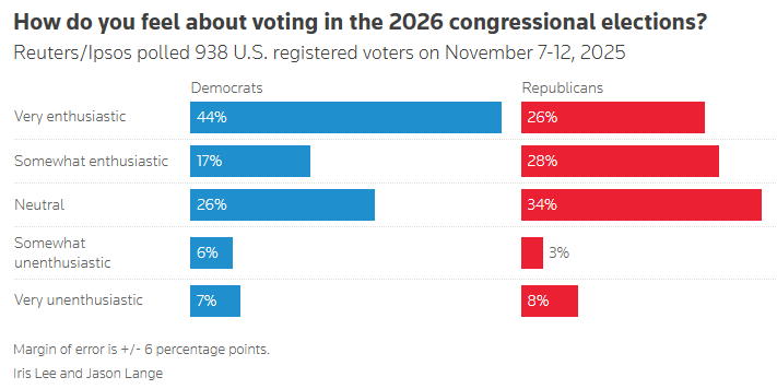 Democrats more energized for 2026 elections than Republicans, Reuters/Ipsos poll finds Jason Lange, Reuters Democrats appear more fired up than Republicans about voting in next year’s congressional elections following the party’s victories in recent state and local contests, according to a new Reuters/Ipsos poll, which showed Republican President Donald Trump’s approval steady at 40%.