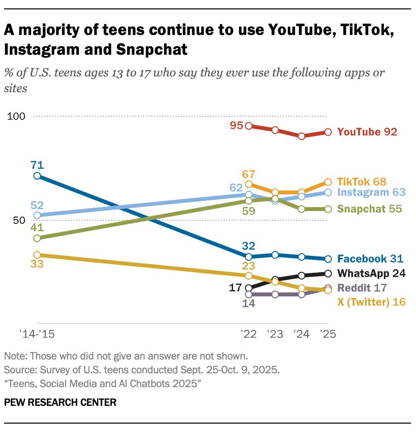 Teens, Social Media and AI Chatbots 2025 Michelle Faverio and Olivia Sidoti, Pew Research Center Roughly 1 in 5 U.S. teens say they are on TikTok and YouTube almost constantly. At the same time, 64% of teens say they use chatbots, including about 3 in 10 who do so daily.