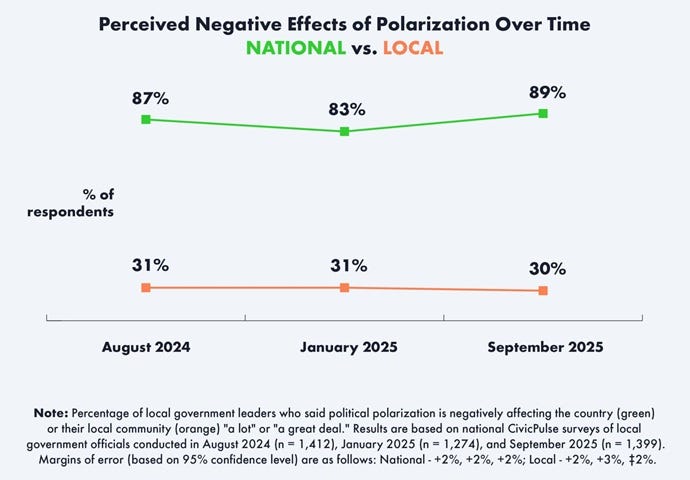 How Polarized Are We? Carnegie Corporation of New York A new survey finds that 89 percent of local officials say polarization is negatively affecting the United States, the highest figure since data collection began in August 2024. In contrast, 30 percent of the same officials say polarization is hurting their local community, a figure unchanged during the past year, suggesting that community life remains resilient despite national strife.