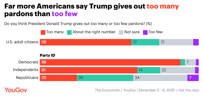 Majorities of Americans say Donald Trump gives out too many pardons and want to limit pardon power Taylor Orth, YouGov A majority of Americans think that Trump uses the presidential pardon power too frequently and most Americans are in favor of placing constitutional limits on the president’s ability to pardon. Far more disapprove than approve of specific recent pardons and commutations given out by Trump.
