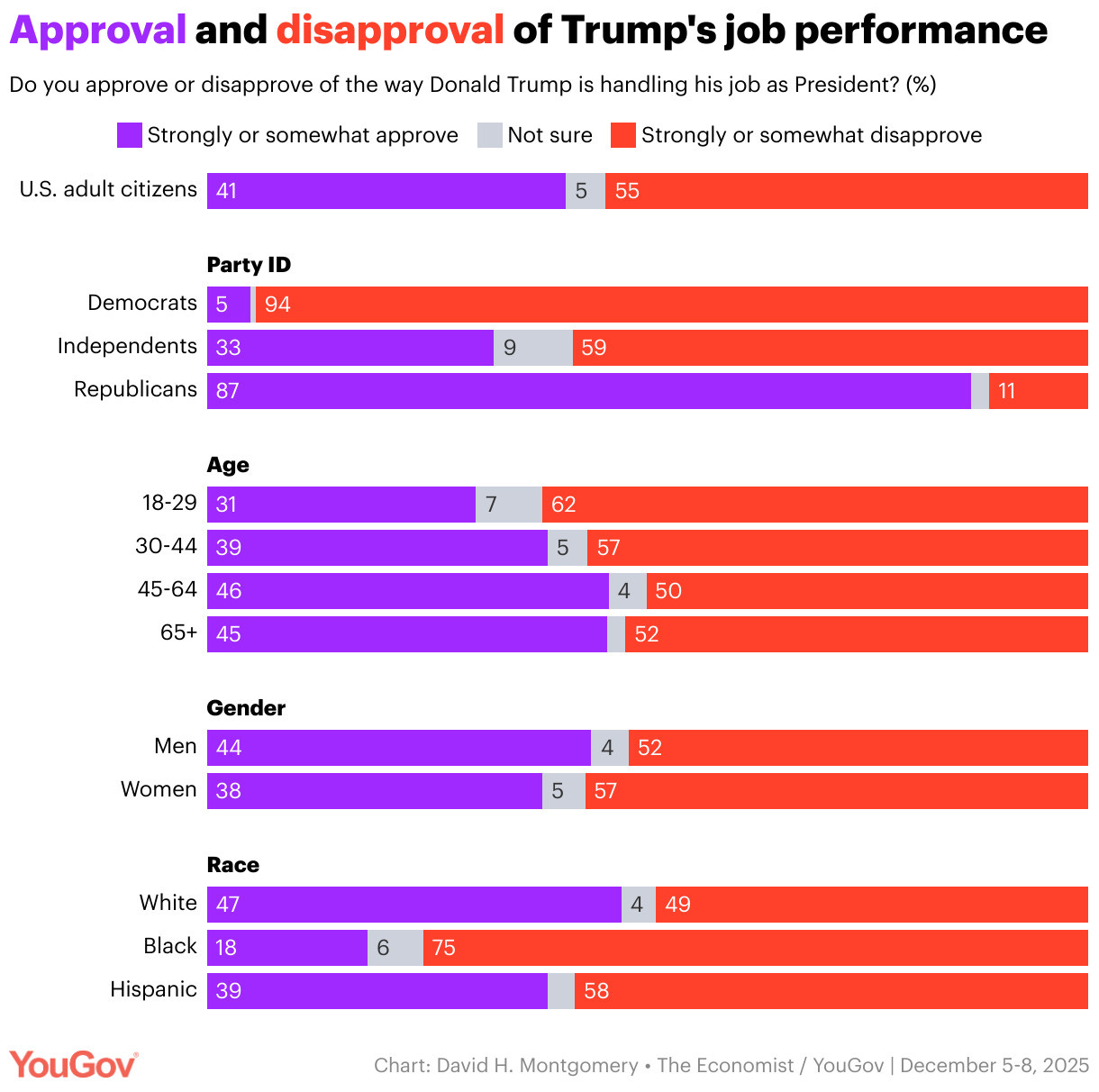 Donald Trump’s job approval rebounds while remaining well below the start of his second term David Montgomery, YouGov 41% of Americans strongly or somewhat approve of Donald Trump’s job performance as president, while 55% disapprove — a net approval of -14. Though sharply negative, this is a big increase from Trump’s -19 net approval last week.