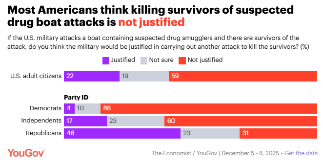 Two-thirds of Americans say drug smuggling is a big problem but are divided on boat attacks Taylor Orth, YouGov Nearly all Americans are concerned about drugs being smuggled into the U.S., but opinions are divided about U.S. military attacks on international drug smugglers. Americans are more than twice as likely to view killing survivors of such attacks as unjustified as they are to believe doing so is justified. Far more Americans have unfavorable than favorable views of Defense Secretary Pete Hegseth.
