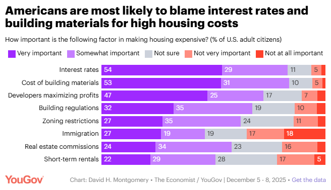Trump approval rating rises as Republicans back cost-of-living efforts Jason Lange, Reuters [via Yahoo] President Donald Trump’s approval rating edged up to 41% in the past week as Republicans warmed to his handling of the cost of living, a sign the administration’s new focus on affordability might be supporting his popularity, according to a new Reuters/Ipsos poll. Americans agree that housing isn’t affordable but disagree on the biggest reasons why David Montgomery, YouGov The vast majority of Americans say finding affordable housing in the U.S. is either very difficult (47%) or somewhat difficult (40%).