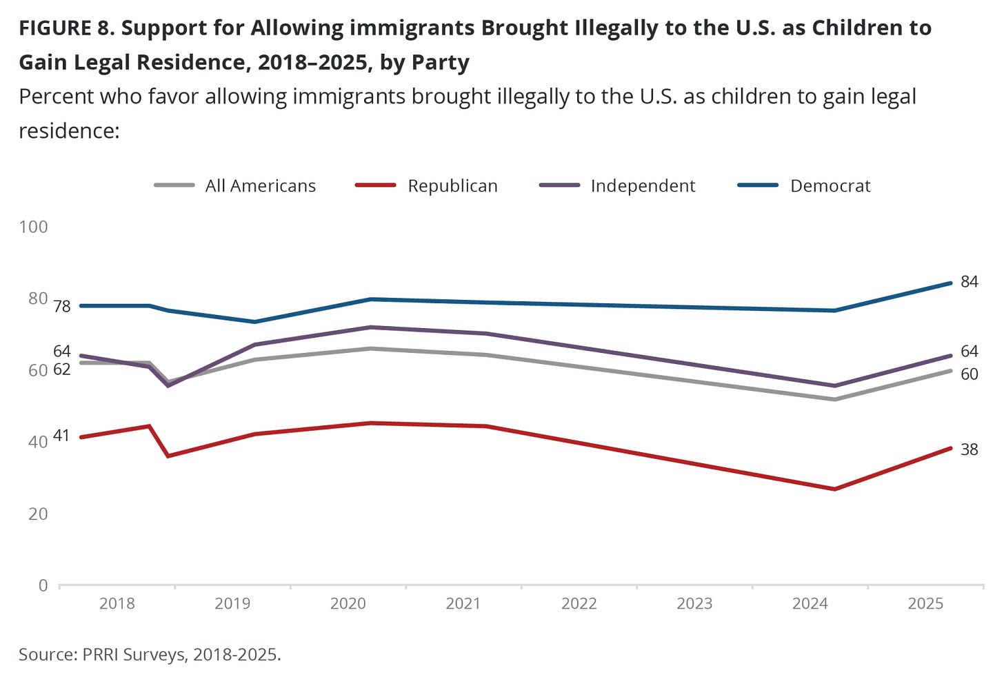 Majority of Americans Disapprove of President Trump’s Immigration Policies PRRI A new report by PRRI finds that support for President Trump’s handling of immigration has declined by 5 points among Americans since March 2025. • Increasing numbers of Americans in the past year support both a pathway to citizenship and allowing “Dreamers” to stay and gain legal status. • Partisan divides remain stark on most of Trump’s immigration policies; yet such polarization is asymmetric, as independents’ views are more closely aligned with Democrats. • Religion shapes views on immigration policies, with white Christians being more supportive of most of Trump’s immigration agenda than Christians of color, members of minority faith traditions, and the religiously unaffiliated.