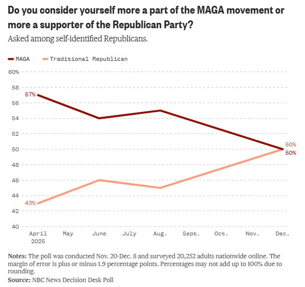 Trump’s MAGA base is still behind him — but cracks are showing ahead of 2026 Stephanie Perry and Marc Trussler, NBC News President Donald Trump’s approval rating remains steadily underwater among adults as he nears the end of his first year back in the White House, and he has lost some ground among his “Make America Great Again” base, according to a new NBC News Decision Desk Poll powered by SurveyMonkey.